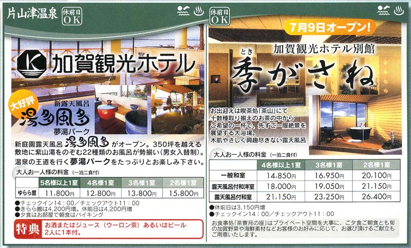 先週末、私用もあり片山津に行ってきました 今年7月OPENの「季がさね」に泊まってきました 宿泊したのは「露天風呂付和洋室」。このカテゴリの部屋は庭園側になるそうです 露天付の和室なら柴山潟を望むお部屋になります 露天風呂は残念ながら沸かしです (露天風呂付和室は源泉100%とのこと) 夕食がなかなか「凝っていて」満足のいく内容 百聞は一見に如かず!? 中央が先付。細工も凝ってます。写真右が鯛の塩釜焼。贅沢でした (食べさしですみません・・・;) 弊社のお得な平日宿泊プランならお一人様14,850円~で宿泊できます (クリックで拡大します) たまには仕事や日常の喧騒を忘れてゆったりするのも大事ですよ |