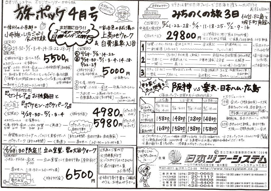 弊社オリジナルの「旅ぽっけ」 第29号、更新しました 今でこそパソコンでチラシを製作していますが 最初は「手作り感が溢れてた方がいいだろう」ということで 手書きで作成していた頃があります 因みに手書き時の作品は ↑こんな感じ 当番制で作成していた時、メールが送られてきて 「汚くて読みづらい。本当に商品を売るつもりがあるか」 といった趣旨のご意見を頂いた時(全く、その通りですと思ったと同時に)、これは考え直さないといけないなぁ、と思ったわけでした 作り手のレベルもあがってきていますので これからも温かい目で見守って頂ければ幸いです |